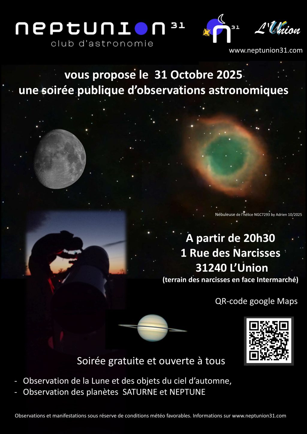 Neptunion31 vous propose une soirée d’observation publique le 31 octobre 2025 à partir de 21h.Au programme : la Lune, Saturne, Neptune et les objets du ciel d’automne. Rendez-vous au 1 rue des Narcisses à l’Union à partir de 20h30 Cette soirée est susceptible d’être annulée si les conditions météo ne sont pas au rendez-vous.